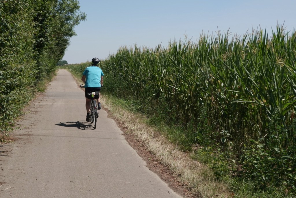Gently down hill. Rather arse shredding gravel paths down hill. Lovely variety of crops and places hugging the Danube. Which is getting exponentially larger. The towns are immaculate and give the air of being prosperous.