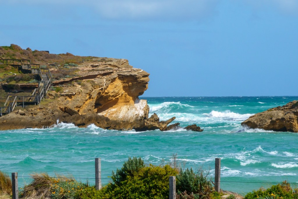 Saying Warrnambool is as hard as spelling it. On the western end of the Great Ocean Road, which is by the sea, it has (it says) a Mediterranean climate. This obviously includes torrents of rain, strong wind and cold. Which was the first half of today’s cycle. As it coincided with being on a relatively busy road with logging lorries lumbering, all was well. We enjoyed the extra spray from the oncoming ones and the suction of the passing ones. Kept you alert.