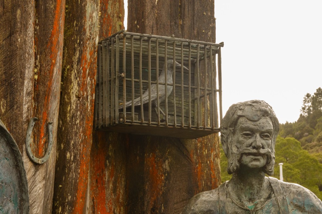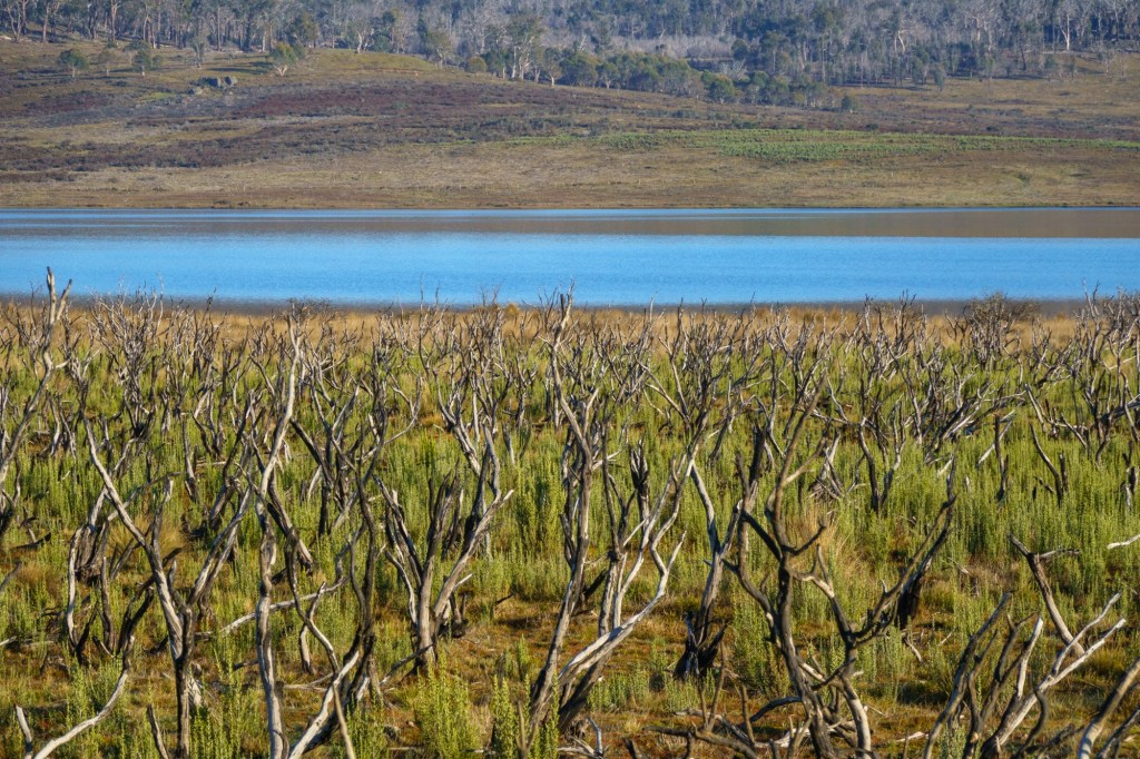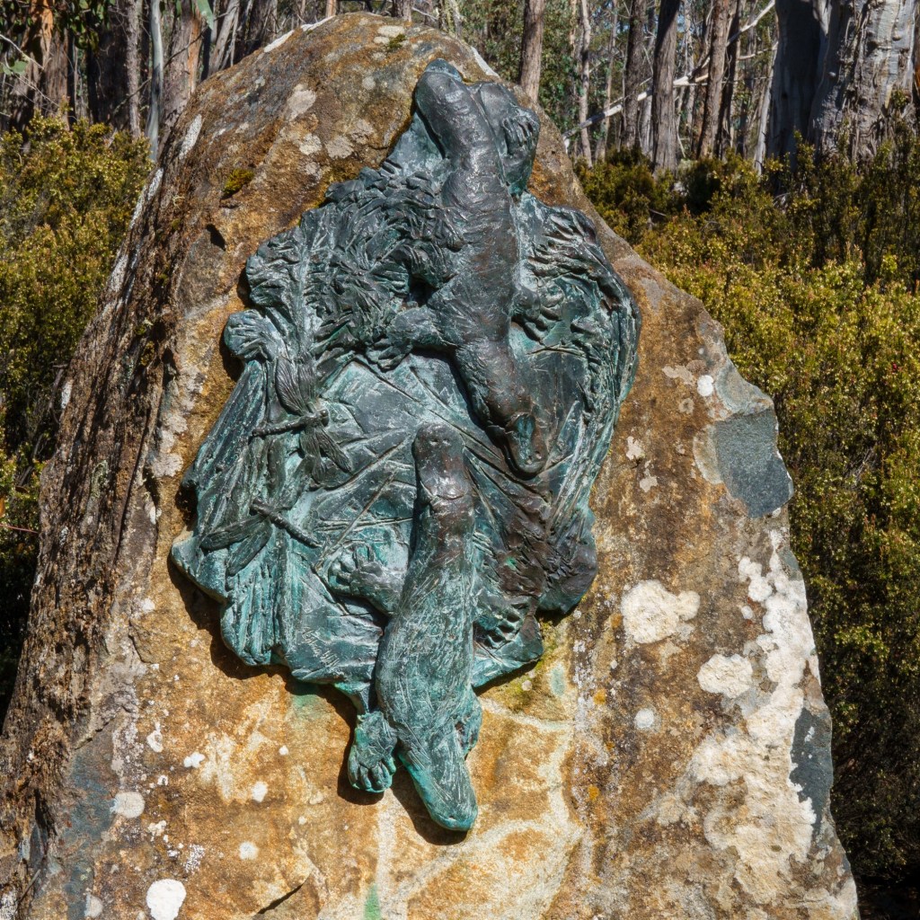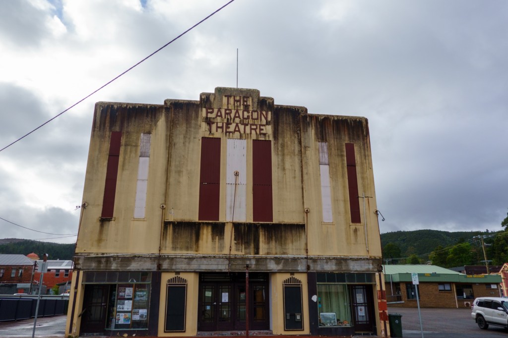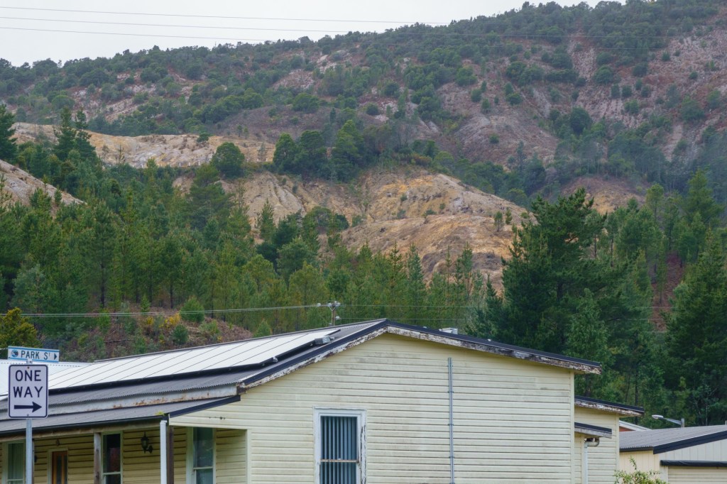 Sheltering from the rain in a road side info booth you learn about the Mount Lyell operations (the area is rich in copper, tin, lead, zinc and other minerals). In nearby Zeehan, the workers used their headlamps to see going home in daylight: yellow smog from the sulphur processes polluting the air, ground, lungs. 100 million tonnes of tailings (the left over bits from the processing of mineral ore) were dumped into the rivers.