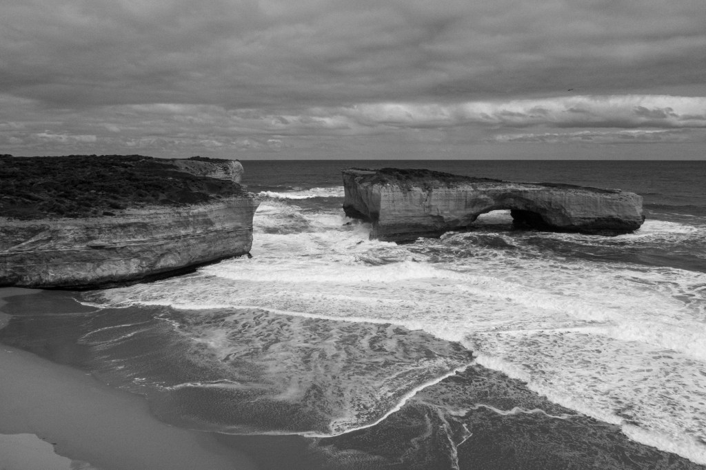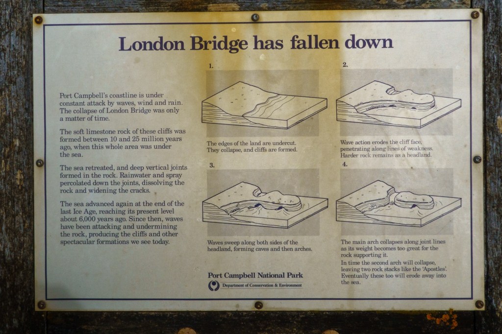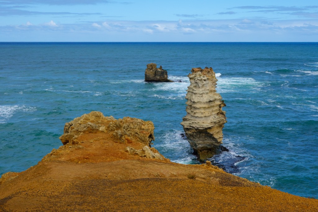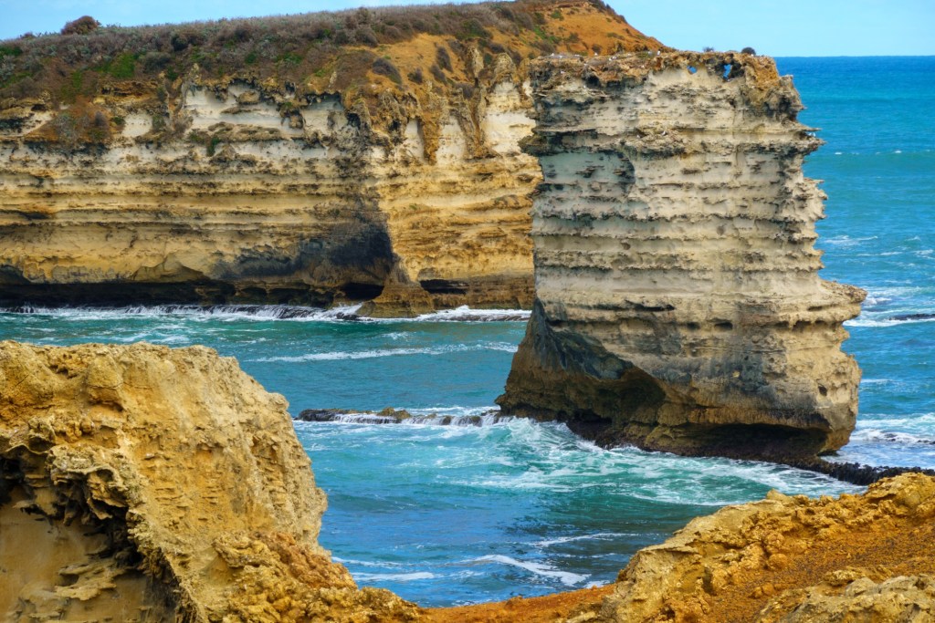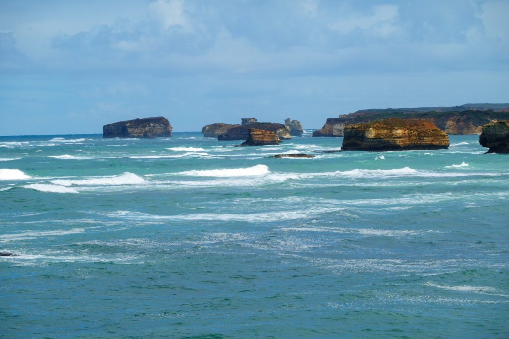 We are near the start of the Great Ocean Road a 238km tourist route to admire the coastal stacks. And they are admirable too. Today we stopped at Bay of Islands, Bay of Martyrs, Grotto and London Bridge. Which strangely is falling down. The geology is probably very complex: the simple version is the softer limestone gets washed away over time either from the surface down or by the sea undercutting. The harder rock erodes far slower and gets left standing: where it forms an arc this eventually collapses due to weight etc. Leaving stacks and other shapes.